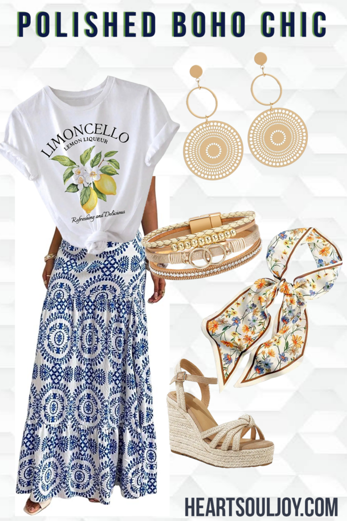 Flowing from that is a blue-and-white patterned maxi skirt, rich with intricate detail. It brings movement, elegance, and that unmistakable boho softness—like something you’d wear wandering a coastal market.