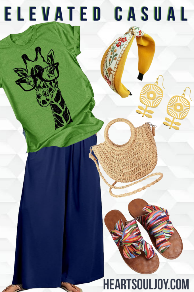 Super cute and bold green giraffe graphic tee – it’s quirky, confident, and impossible to ignore. It brings the humor and charm, like a wink in outfit form. But instead of leaning fully casual, it’s paired with flowy navy wide-leg pants, instantly elevating the look. The silhouette is long, relaxed, and refined—giving structure to the tee’s playful energy.