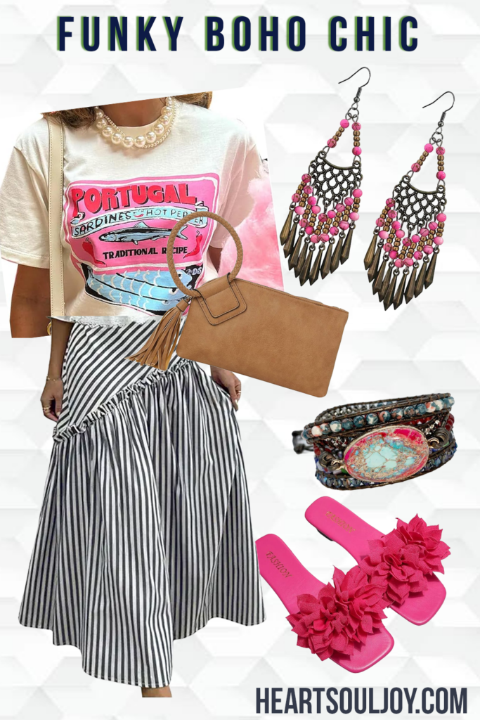 At the center of this funky fun fit is a retro-inspired graphic tee with bold and playful colors, big on the boho, even bigger on the cute. It’s giving thrifted treasure with main-character energy. Paired with it is a black-and-white striped midi skirt with an asymmetrical ruffle. The structure of the stripes adds polish, while the movement of the ruffle keeps things loose and bohemian. The bright pops of pink throughout tie everything together.
