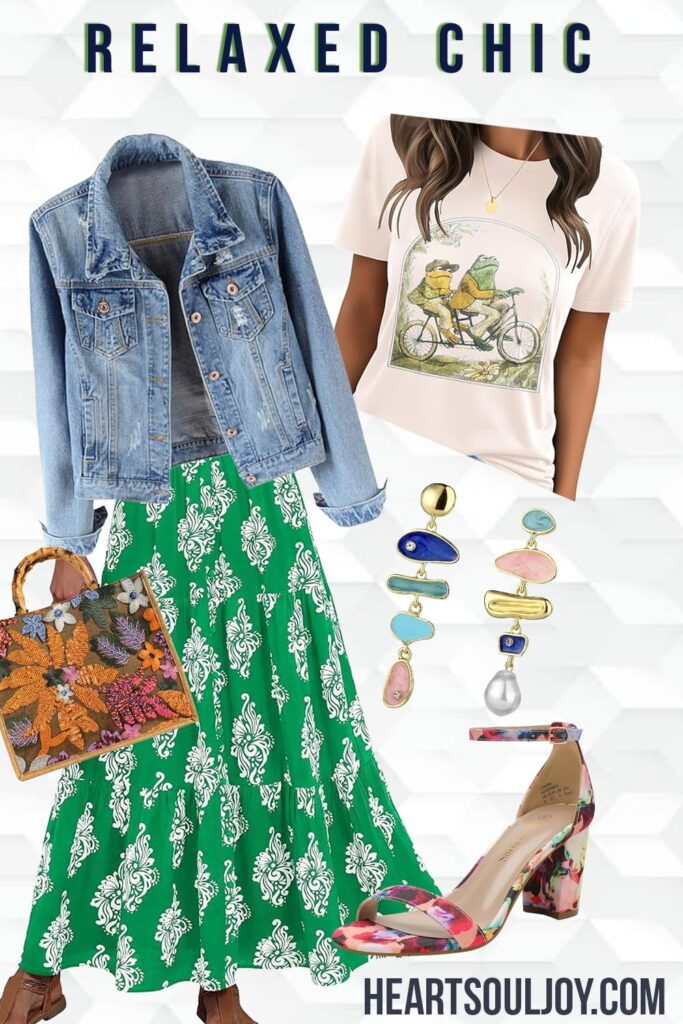 At the center of this springtime casual fit is a light, whimsical graphic tee featuring a vintage-style illustration that feels playful, a little nostalgic, and super comfortable with maintaining elegant vibes. Flowing from there is a green printed maxi skirt, full of movement and life. The pattern adds a classic, almost botanical elegance, while the breezy silhouette keeps things easy and wearable. Layered on top is a light-wash distressed denim jacket—your springtime safety net. It adds structure, a bit of cool, and just enough warmth for those not-quite-summer breezes.