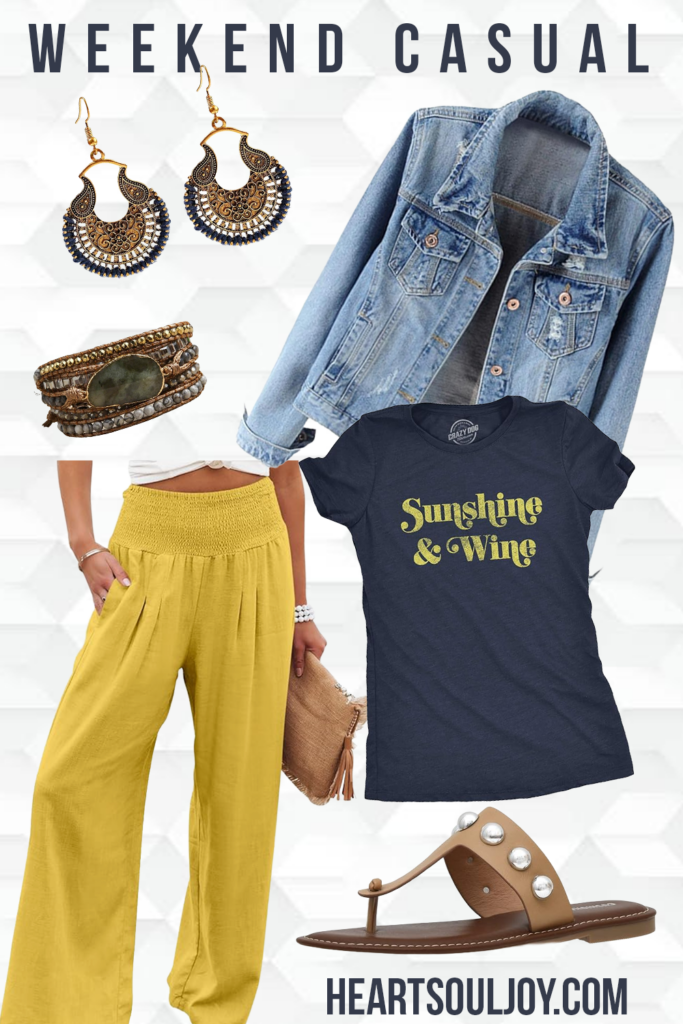 At the heart, this outfit is relaxed and easygoing. Paired with it are flowy mustard-yellow wide-leg pants that bring movement and brightness. They catch the light like sunshine itself, adding that signature boho softness while keeping things breathable and comfortable. Layered on top with a light-wash distressed denim jacket. I love this one in particular and wear it all the time as a teacher! Paired with some cute earings and an even cuter boho wrap bracelet, some