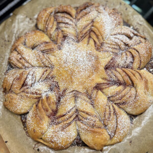If you’re looking for a show-stopper that’s surprisingly approachable — perfect for Christmas breakfast or a winter brunch — I absolutely recommend giving the Raspberry Cardamom Snowflake Pull-Apart Wreath a try.