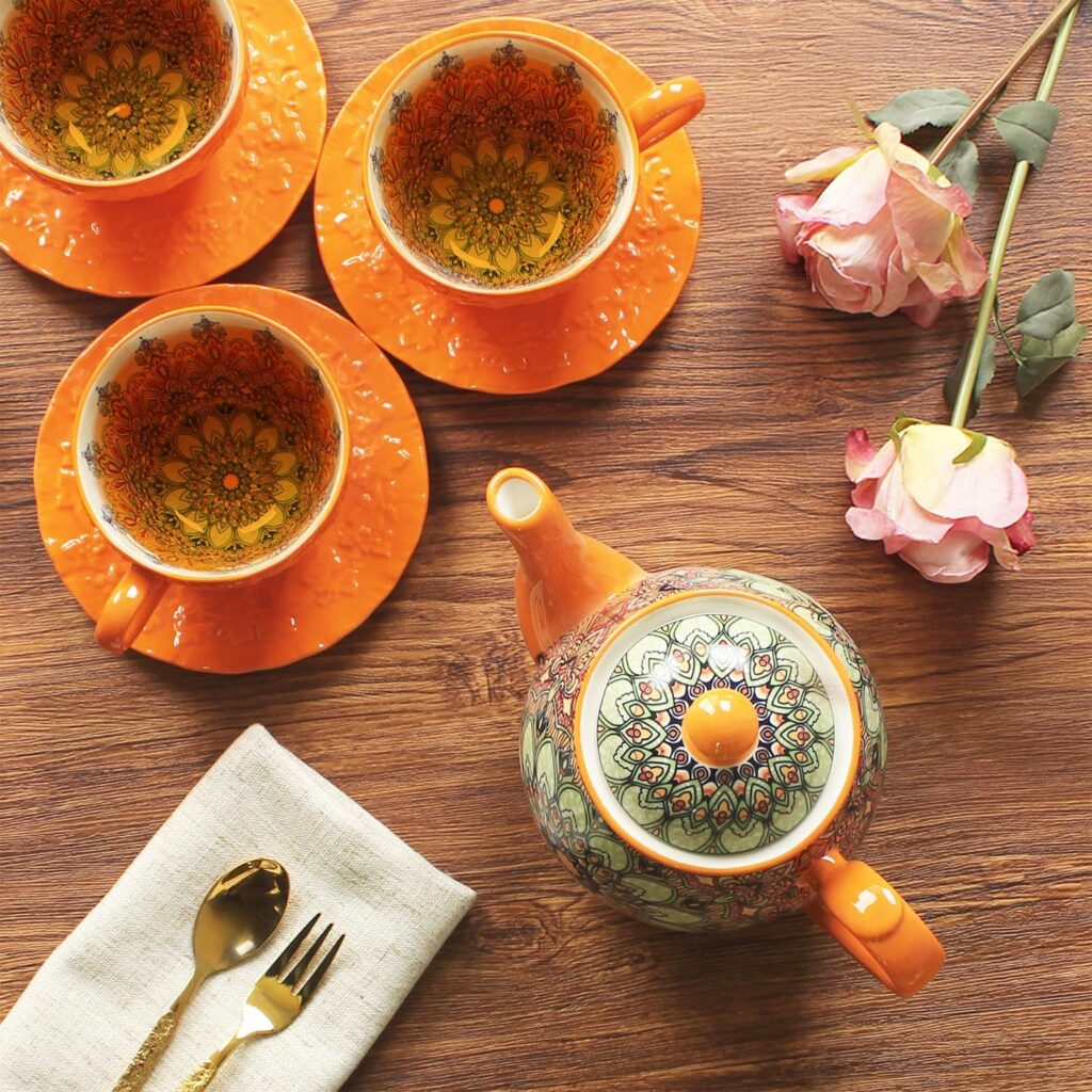 The 34.2oz teapot is paired with 4 8.5oz cupS, both featuring appropriately sized curved handles. The teapot lid not only features a round knob for easy removal but also an internal locking mechanism to prevent slippage during pouring, eliminating inconvenience and safety hazards. I love the boho design !